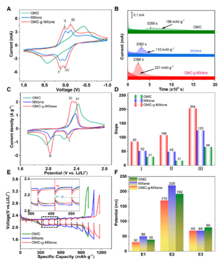 Fig 2. (A)基于 OMC、MXene 和 OMC- g -MXene 電極的 Li2S6對稱電池在 5 mV s-1時的 CV 曲線。(B)用于評估 Li2S 成核動力學的帶有 Li2S8 陰極電解液的三個修飾電極在 2.05 V 下的恒電位放電曲線。(C) 具有催化層的 Li-S 電池的 CV 曲線。(D) ip的斜率總結與不同峰中掃描速率的平方根。(E) 在 0.1 C 下具有三個夾層的 Li-S 電池的 GITT 和 (F) 從 GITT 技術計算的相應過電勢。