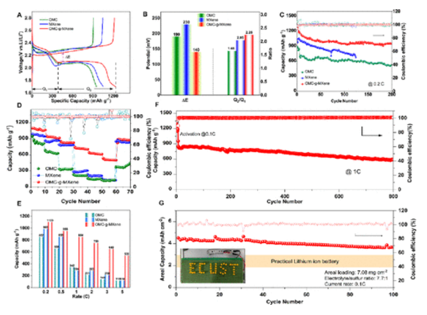 Fig 3. (A) 基于各種夾層的鋰硫電池在 0.2 C 時的電壓曲線比較。(B) 在 0.2 C 時 ΔE和Q2/Q1比率的相應總結。 (C) 循環穩定性測試基于各種夾層的 Li-S 電池在 0.2 C 下的性能。(D)OMC、MXene 和 OMC- g -MXene 異質結構改性電池的倍率性能。(E) 不同電流速率下容量保留的比較。(F) OMC- g - MXene異質結構修飾電池的長期循環穩定性。(G) 高負載電池在 OMC- g - MXene 異質結構上作為貧電解質夾層的循環穩定性測試。