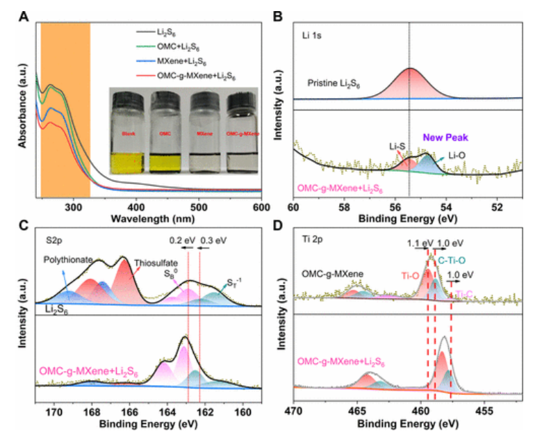 Fig 4. (A) 不同溶液在 Li2S6溶液中充分浸泡 6 小時后的紫外-可見吸收光譜。插圖:Li2S6吸附實驗的光學照片。(B–D) Li2S6吸附前后OMC- g -MXene異質結構中Li 1s、S 2p和Ti 2p的高分辨率X射線光電子能譜對比。