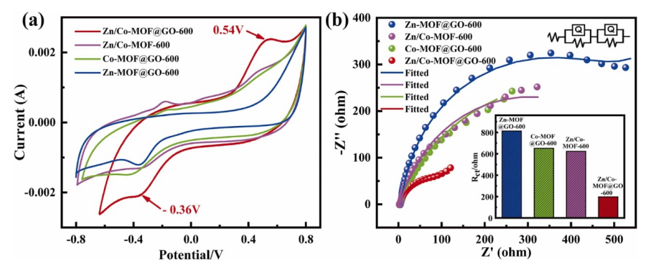 Fig 3. (a) 不同催化劑的循環(huán)伏安法 (CV) 曲線,(b) 電化學(xué)阻抗譜 (EIS) 圖,以及不同催化劑對(duì)應(yīng)的電荷轉(zhuǎn)移電阻 (R ct )(插圖)。