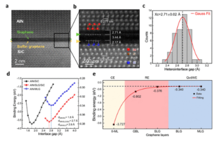 圖2.AlN/SLG/SiC的界面原子結(jié)構(gòu)和DFT計(jì)算.(a) AlN/SLG/SiC界面的HR HAADF-STEM圖像。(b) (a)中綠框的放大圖像。(c) 通過(guò)HR HAADF-STEM分析測(cè)量的AlN和SLG異質(zhì)界面間隙的直方圖。(d) 結(jié)合能曲線繪制為AlN/SiC(黑線)、AlN/SLG/SiC(紅線)和AlN/MLG(藍(lán)線)異界面間隙的函數(shù)。(e)不同石墨烯層覆蓋的SiC襯底上的結(jié)合能比較。