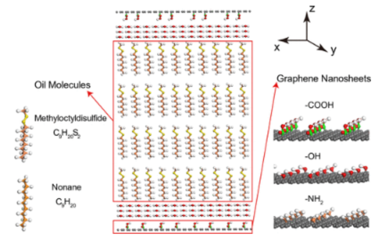 圖1. 仿真模型(以-COOH功能化的通道為例)。本研究模擬了兩種不同的油:極化甲基辛基二硫化物(C