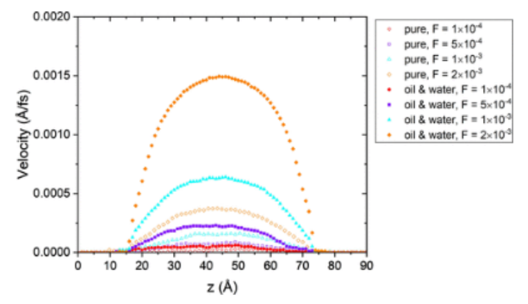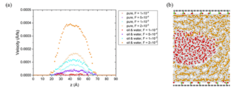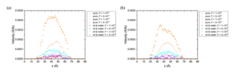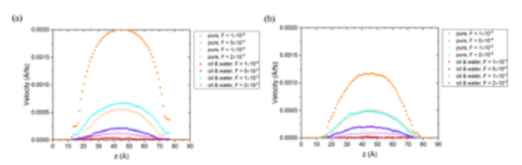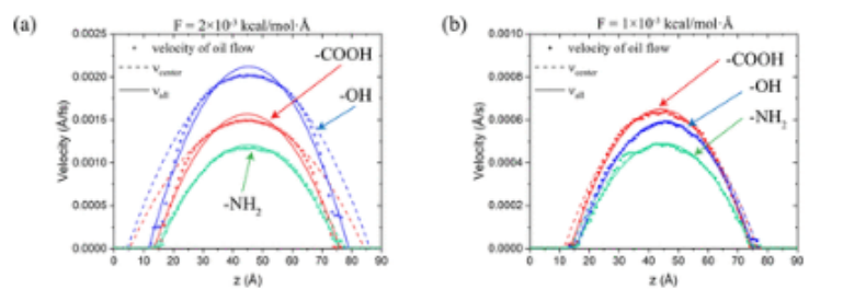 圖11.(a) -COOH功能化石墨烯通道中純油和水-油系統的速度分布。這里的油是非極性壬烷。(b) F=2×10