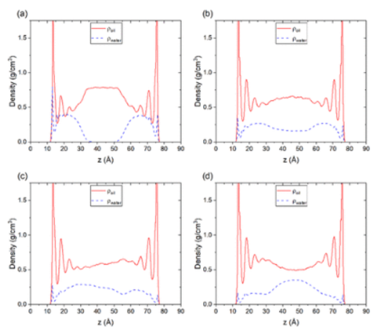 圖2:(a) -COOH功能化石墨烯納米通道的平衡系統快照(暗區代表油分子,亮區代表水分子);(b) 河道中水和油的靜態密度分布。