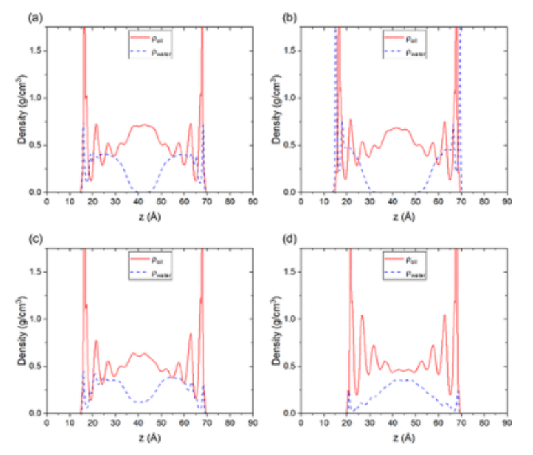 圖3. 在不同驅動力下,-COOH官能化石墨烯通道中水和極化油分子的密度分布:(a)F=1×10