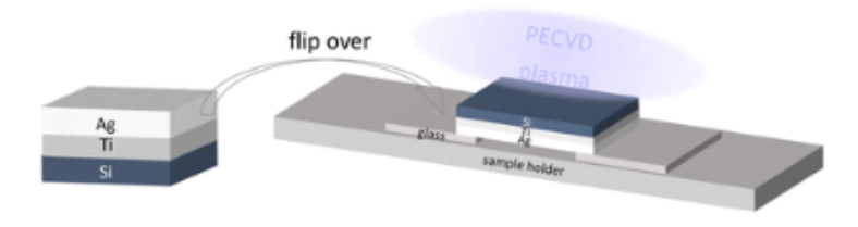 圖1.翻轉(zhuǎn)Ag/Ti/Si襯底并將其放置在樣品支架上以在Ag上直接PECVD石墨烯生長的示意圖。