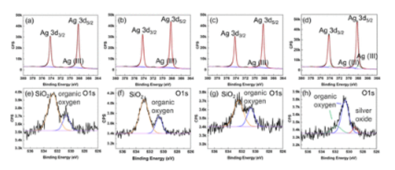 圖5.PECVD工藝之后快速獲得的生長時間為(a,e)15,(b,f)10,(c,g)5分鐘的XPS Ag 3d和O1s光譜,以及參考樣品(d,h)的XPS Ag3d和O1S光譜,顯示了PECVD工藝后所有樣品的氧化銀組分大大減少。