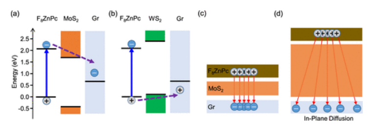 2和石墨烯的導帶和價帶。光激發電子(−)有望轉移到石墨烯,而空穴(+)位于F
