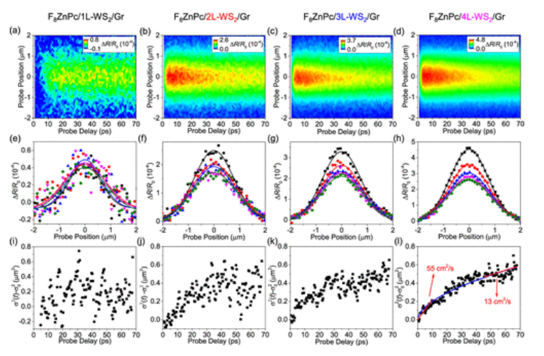2/石墨烯異質結構樣品測量的時空分辨差分反射率。(e–h)4個樣品的差分反射率的選定空間分布。對于(e),探測延遲為2.8(黑色)、10.2(紅色)、17.7(藍色)、25.1(粉色)和33.0 ps(綠色)。對于(f)、(g)和(h),探測延遲為5.5(黑色)、20.4(紅色)、35.3(藍色)、50.2(粉色)和65.0 ps(綠色)。實心曲線為高斯擬合。(i–l)空間分布方差隨探測延遲的變化。直線是線性擬合。