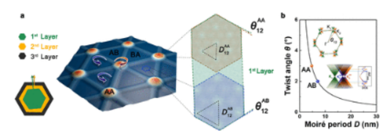 圖1. 被最上面的摩爾紋放大的局部晶格旋轉示意圖。(a) 左邊面板。TTG的草圖。中間面板。底層小角度TBG的摩爾紋圖案示意圖。右邊面板。第一層和第二層之間局部扭曲角的模擬圖像。(b) 扭曲角是摩爾紋周期的一個函數。插圖顯示了第一布里淵區和TBG的電子帶結構。K