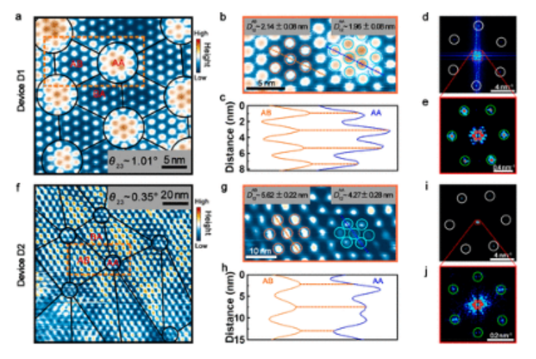 圖2. TTG的結構表征。(a,f) STM拓撲圖顯示了兩個TTG樣品上的 "雙摩爾 "超晶格。拓撲圖分別在1V和200 pA,以及0.25V和400 pA下拍攝。疊加的圓圈和線條描述了TBG底層的摩爾紋結構。 (b,g)分別是(a,f)中橙色框架內的STM圖像。沿著虛線的輪廓線顯示在(c,h)。(d,e) 器件D