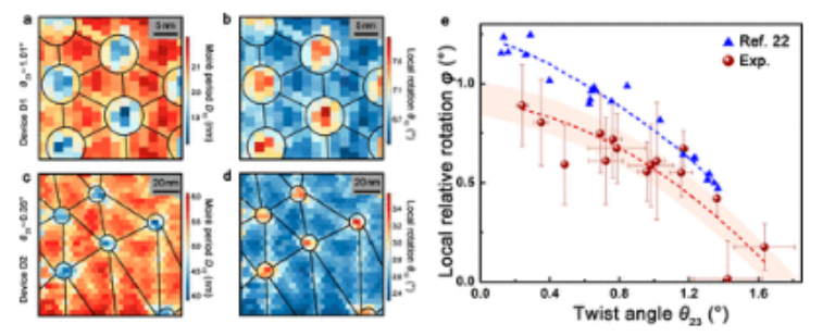 12的空間變化。(a-d)中重疊的圓圈和線條描述了底層TBG中的摩爾紋結構。 (e) 紅色實心點顯示了不同器件上測量的平均φ與θ