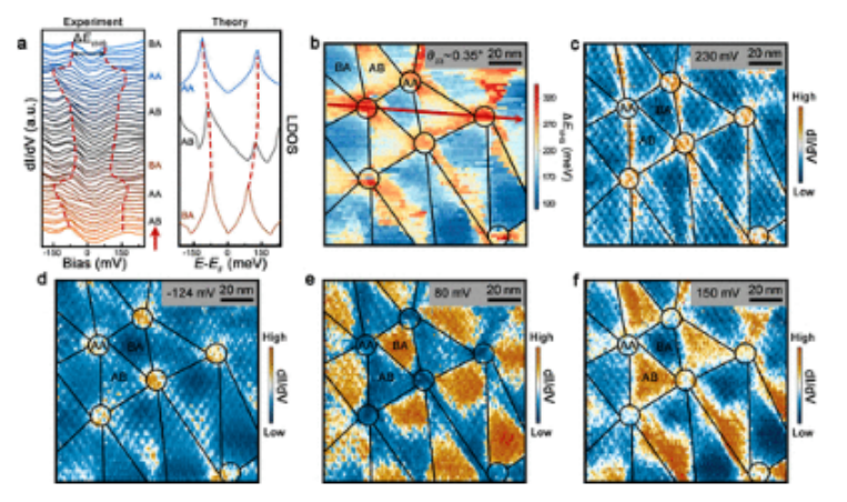 圖4. TBG中結構重建引起的電子特性的空間變化。 (a) 實驗(左圖)和理論(右圖)的dI/dV光譜沿著(b)圖中D2裝置的箭頭。(b) 最上面的TBG中的ΔEVHS地圖,根據在不同位置記錄的13160光譜繪制。(c-f) θ