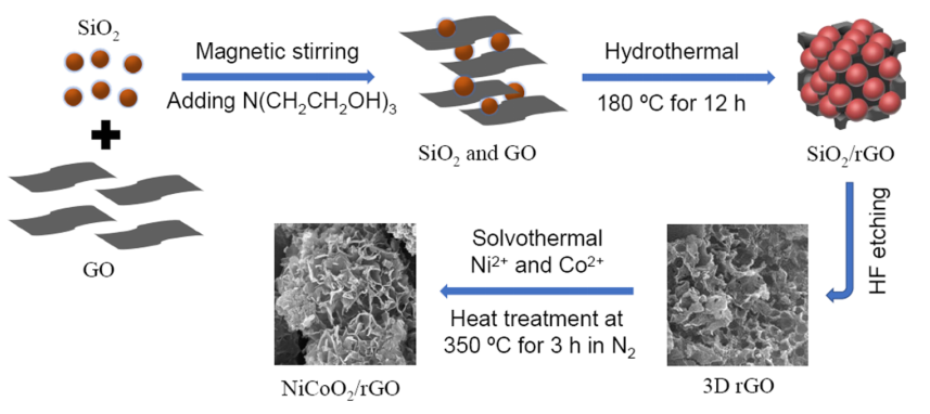 2陽極在循環(huán)過程中導(dǎo)電性不理想,體積變化嚴(yán)重,導(dǎo)致倍率性能不理想,循環(huán)穩(wěn)定性差。為了解決這些問題,以蜂窩狀三維還原氧化石墨烯為載體,通過溶劑熱法制備了NiCoO