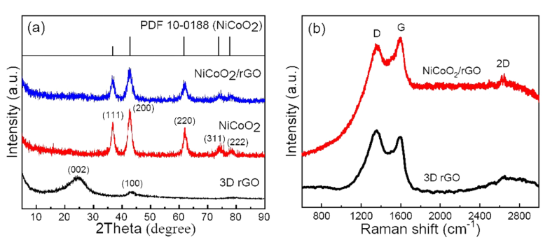 2/rGO的XRD譜圖。(b) 3D rGO和NiCoO