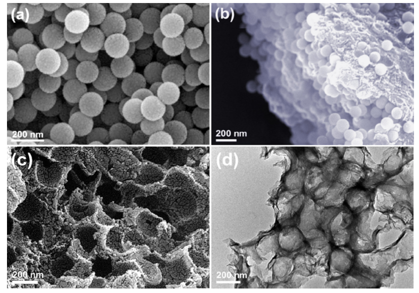 2/rGO和(c) 三維 rGO的SEM圖像。(d)三維rGO 的TEM圖像。