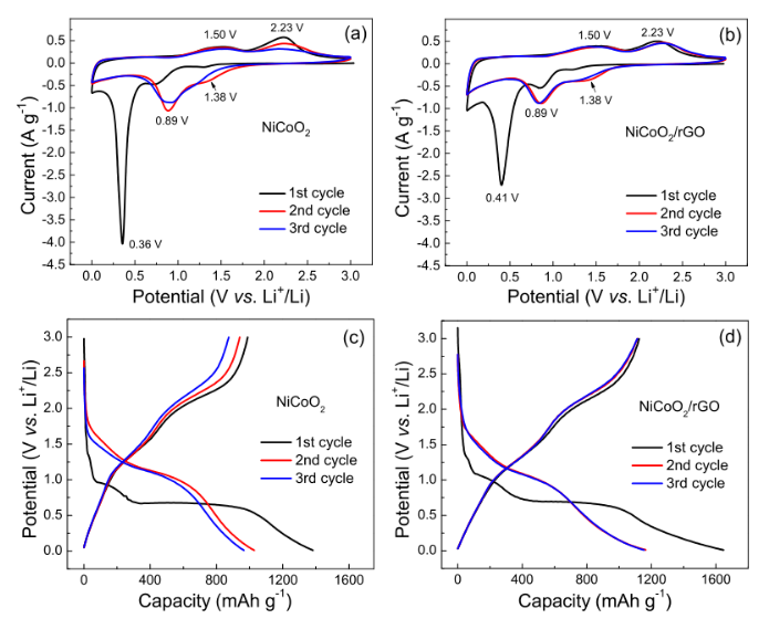 2/rGO電極前三個循環(huán)的放電/充電曲線。