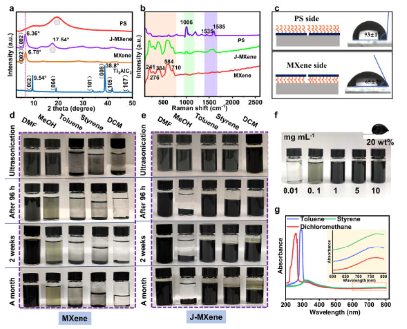 圖1 (a) 制備過程和(b) 甲苯分子與J-MXEN納米片之間的溶解度原理示意圖。(c)J-MXEN在甲苯或水中的分散及其大面積的膜。
