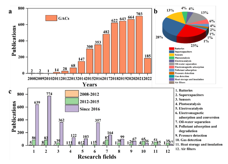 圖1. (a) 2008年至2022年GACs發(fā)展情況;(b) GACs的研究分布情況和(c) GACs在每個(gè)領(lǐng)域在不同階段的出版物。