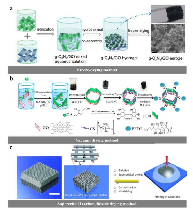 圖3. (a) Gr/CNT氣凝膠、(b) C -HPMC /rGO-x、(c) GO-COS和(d) C-AL/CNF-5多孔結(jié)構(gòu)的制備過程。