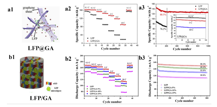 圖6.鋰離子電池中LFP@GA和LFP/GA的(a1, b1)理論模型,(a2, b2)倍率性能和(a3, b3)循環(huán)穩(wěn)定性 。