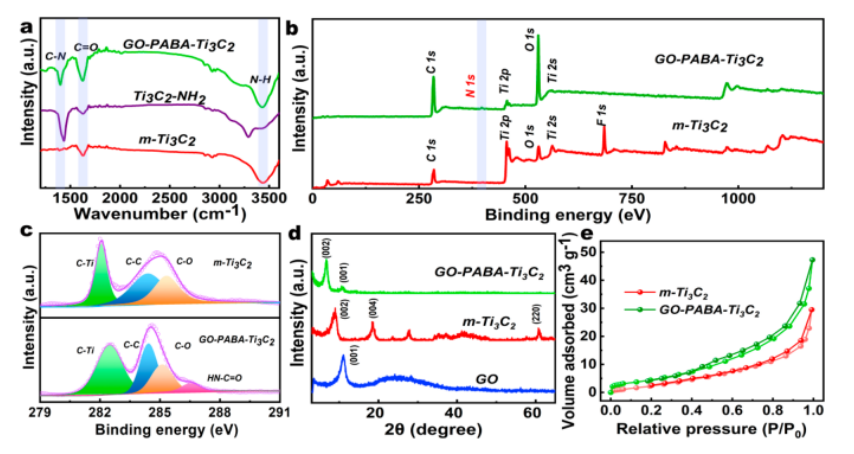 圖2 (a) m-Ti3C2、Ti3C2-NH2和GO-PABA-Ti3C2的FTIR光譜。(b)純m-Ti3C2和GO-PABC-Ti3C2的XPS測量光譜和(c) c 1s高分辨率光譜。(d) GO、m-Ti3C2和GO-PABC-Ti3C2的XRD圖案。(e) m-Ti3C2和GO-PABC-Ti3C2的N2吸附/解吸曲線。
