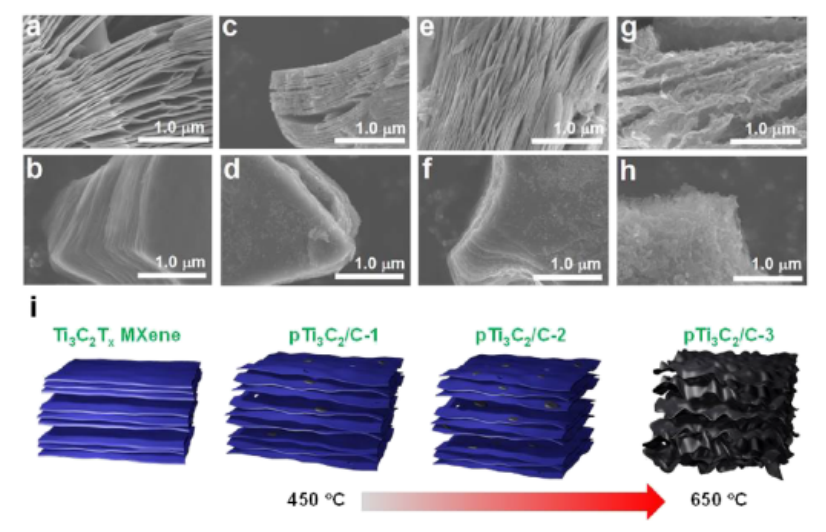 圖4 (a、b) Ti3C2Tx MXene、(c、d) pTi3C2/C-1、(e、f) pTi3C2/C-2、(g、h) pTi3C2/C-3的SEM圖像;(i)從Ti3C2Tx MXene到pTi3C2/C復(fù)合材料的結(jié)構(gòu)演變。