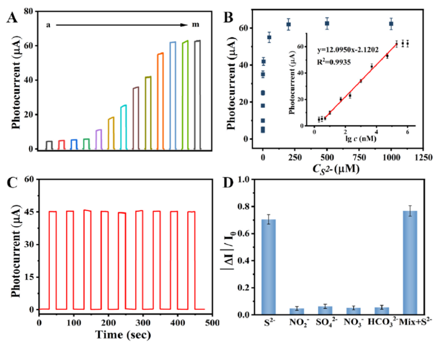 圖5. (A)制備的PEC傳感器在PBS中培養(yǎng)的光電流響應(yīng),包括0 (a), 0.002 (b), 0.003 (c), 0.005 (d), 0.01 (e), 0.05 (f), 0.2 (g), 1 (h), 5 (i), 50 (j), 200 (k), 1000 (l), 2000 μM (m)的S
