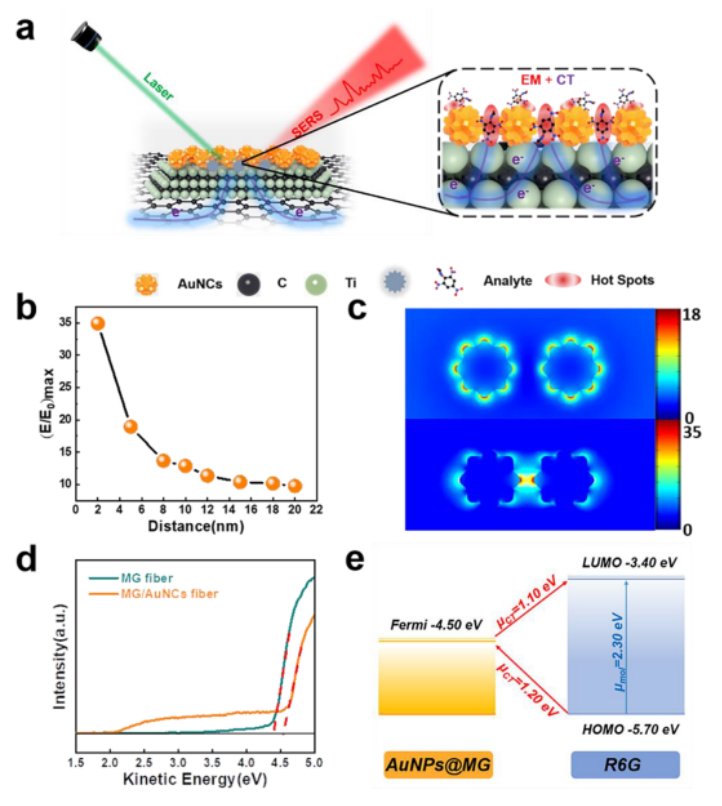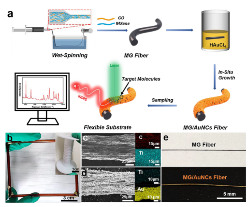 x MXene@graphene氧化物/Au納米簇(MG/AuNCs)纖維SERS襯底。MG纖維的使用為SERS傳感器提供了良好的靈活性(114 MPa)和電荷轉移增強(化學機制,CM),并允許在其表面進一步原位生長AuNCs來構建高靈敏度熱點(電磁機制,EM),促進了基底在復雜環境中的耐久性和SERS性能。因此,形成的柔性MG/AuNCs