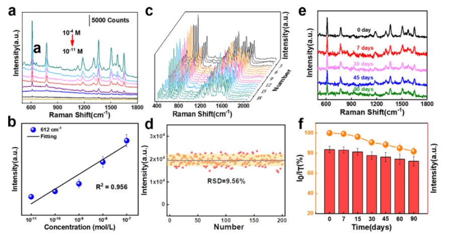−1處R6G的SERS光譜的衰減和(f) 612 cm−1處對應的拉曼強度隨時間的變化。