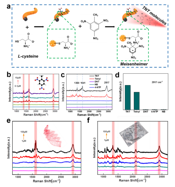 -1纖維通過形成Meisenheime復合體實現了對三硝基甲苯(TNT)分子(0.1 μM)的微量和選擇性檢測,甚至可以通過在指紋或樣品袋中采樣TNT分子。這些發現填補了大規模制備高性能二維材料/貴金屬粒子復合SERS基板的空白,有望推動柔性SERS傳感器向更廣泛的應用方向發展。