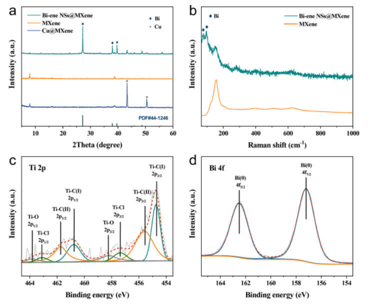 圖2 (a) Cu@MXene、純MXene和Bi-ene NSs@MXene異質(zhì)結(jié)構(gòu)的XRD圖譜。(b)純MXene和Bi-ene NSs@MXene異質(zhì)結(jié)構(gòu)的拉曼光譜。(c) Bi-ene NSs@MXene異質(zhì)結(jié)構(gòu)的高分辨率Ti 2p和(d) Bi 4f XPS光譜。