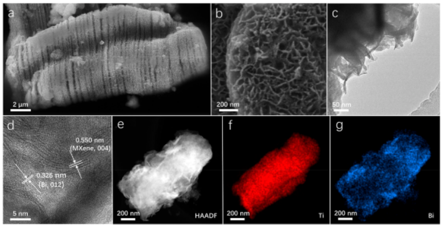 圖3. (a, b)典型的SEM圖像,(c, d) TEM圖像和(e−g) HAADF-STEM圖像以及Biene NSs@MXene異質(zhì)結(jié)構(gòu)的相應(yīng)元素映射。