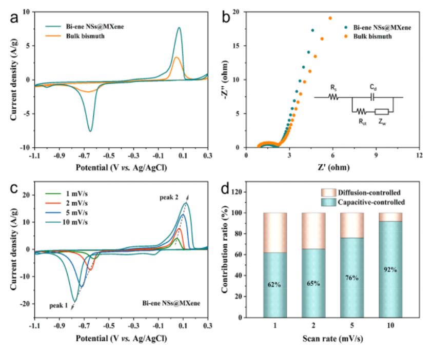 圖4 (a)雙烯NSs@MXene異質(zhì)結(jié)構(gòu)和本體鉍在2 mV/s下的CV曲線。(b) Bi-ene NSs@ MXene異質(zhì)結(jié)構(gòu)和本體鉍的奈奎斯特圖。(c) CV曲線和(d)不同掃描速率下雙烯NSs@MXene異質(zhì)結(jié)構(gòu)的電容貢獻(xiàn)。