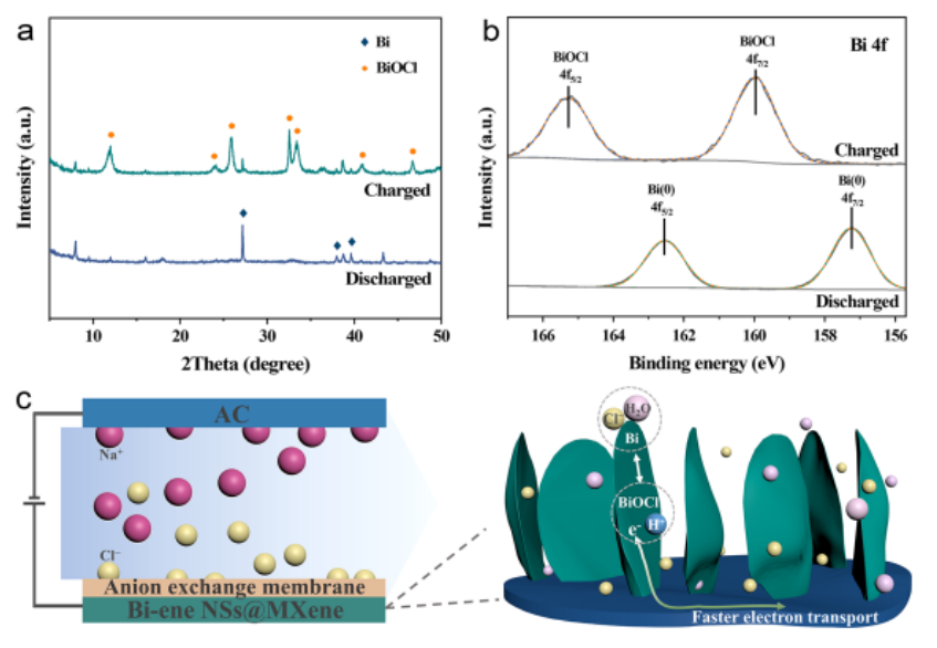 圖6 (a)在海水淡化過程中帶電/放電狀態(tài)下的Bi-ene NSs@MXene異質(zhì)結(jié)構(gòu)的XRD分析。(b)雙烯NSs@MXene異質(zhì)結(jié)構(gòu)在帶電/放電狀態(tài)下的高分辨率Bi 4f光譜。(c)以雙烯NSs@MXene異質(zhì)結(jié)構(gòu)作為負(fù)電極的組裝HCDI系統(tǒng)的示意圖。