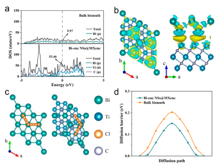 圖7 (a)雙烯NSs@MXene異質(zhì)結(jié)構(gòu)和本體鉍的總和部分態(tài)密度(DOS)。(b)雙烯NSs@MXene異質(zhì)結(jié)構(gòu)的差異電荷密度。電荷的積累和消耗分別用淺黃色和藍(lán)色表示。(c)氯離子在雙烯NSs@MXene異質(zhì)結(jié)構(gòu)和本體鉍表面的擴(kuò)散路徑示意圖。(d) Cl