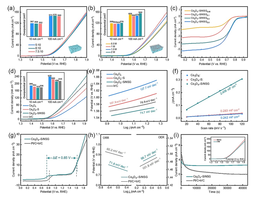 Fig 5. 由各種 (a) 反應物比例 (5/6/7.5:10) 和 (b) 硫化溶液 (0.5/1/1.5/2 M Na2S) 制備的 Co3O4–S 的 OER 極化曲線(插圖:電流密度下過電勢的比較10 和 100 mA cm–2)。 (c) 具有不同 NSG 含量的 Co3O4–S/NSG 的 ORR 極化曲線。 (d) OER 極化曲線(插圖:電流密度為 10 和 100 mA cm-2 時的過電勢比較)和 (e) Co3O4、Co3O4-S、Co3O4-S/NSG 和 Ir/C 的相應 Tafel 斜率。 (f) Co3O4、Co3O4–S 和 Co3O4–S/NSG 的 Cdl。 (g) Co3O4–S/NSG 和 Pt/C+Ir/C 的雙功能極化曲線,(h) 相應的 Tafel 斜率和 (i) 1.553 V 時的計時電流響應(插圖:測試前后極化曲線的比較)。