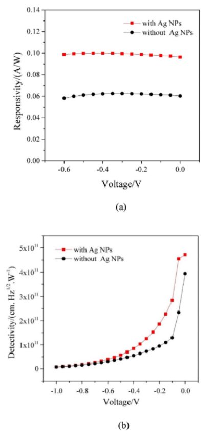 本文制備了Ag納米粒子(NPs)石墨烯/砷化鎵近紅外光探測器,并研究了該探測器在近紅外光下的光電特性。通過在器件表面旋鍍30 nm Ag NPs層,Ag NPs的局部表面等離子體共振(LSPR)可以增強近紅外光的吸收,從而提高器件的靈敏度。與不含Ag NPs的器件相比,該器件在808 nm近紅外光零偏置電壓下的響應率顯著提高到96 mA/W(提高了1.6倍),器件的最大探測率可達4.72 × 1011 cm Hz1/2W-1。此外,該裝置的響應時間(τr)和恢復時間(τf)分別為28.21 μs/68.11 μs。與不含Ag NPs的器件相比,該探測器的量子效率從37%提高到84%。這表明石墨烯/砷化鎵光電探測器在近紅外探測領域具有廣闊的應用前景。