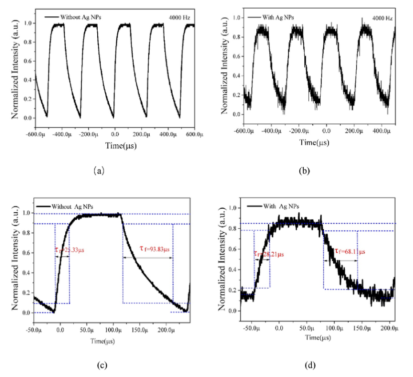 圖7. 器件在4000Hz零偏置時的頻響圖(a)不含Ag NPs的器件。(b)含Ag NPs的器件。(c)不含Ag NPs的器件響應時間和恢復時間。(d) 含Ag NPs的器件的響應時間和恢復時間。