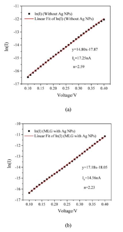 圖8. (a)不含Ag NPs的器件暗電流擬合圖。(b) 含Ag NPs的器件暗電流擬合圖。