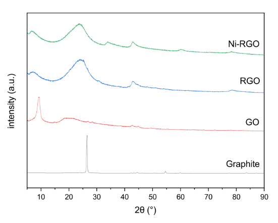 圖2. 石墨, GO, RGO 和 Ni-RGO的XRD譜。