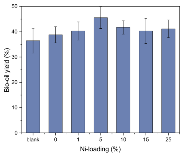 在本研究中,制備了一種負載鎳的還原氧化石墨烯(RGO)材料,據作者所知,這是RGO材料首次作為催化劑用于微藻類的熱液液化(HTL)。研究了還原氧化石墨烯負載鎳催化劑對螺旋藻HTL生物油產率和質量的影響。結果表明,該催化劑能提高生物油的產率,生物油質量的性能顯著提高。GC-MS分析表明,RGO催化劑能促進碳氫化合物的生成。當Ni添加量為5%時,生物油的氧含量最低(14.79%),當Ni添加量增加到25%時,碳氫化合物含量最高(11.41%)。此外,RGO催化劑還能使生物油中低沸點組分(<400℃)的含量從68%提高到81%。本研究可為石墨烯在微藻HTL中的進一步應用和高品質生物油的生產提供有價值的信息。