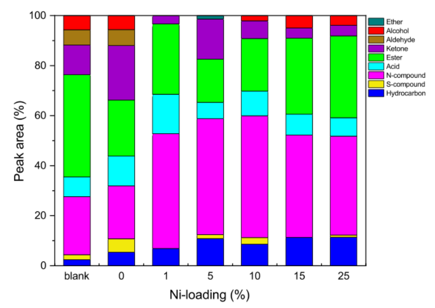 圖6. 不同催化劑對生物油的GC-MS分析。