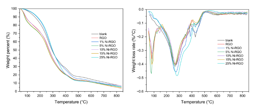 圖7. 生物油在不同催化劑時的TG/DTG曲線。