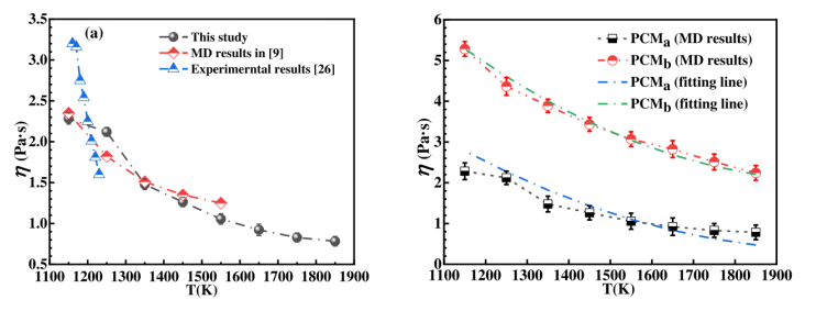 圖6. 仿真系統的粘度,(a) PCMa, (b) PCMa 與PCMb的比較。