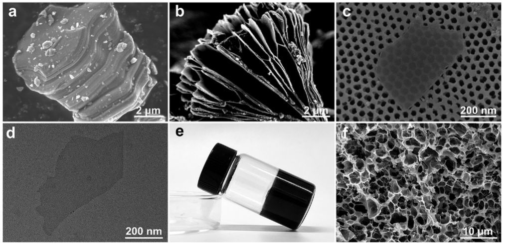 Fig 1. a) Ti3AlC2(MAX 相)、b) 未剝離的 MXene (Ti3C2Tx ) 和 c) 充分剝離的 MXene 納米片的掃描電子顯微鏡 (SEM) 圖像。d)MXene納米片的透射電子顯微鏡(TEM)圖像。e) MXene 水凝膠的數碼照片。f) 冷凍干燥的 MXene 水凝膠的 SEM 圖像。