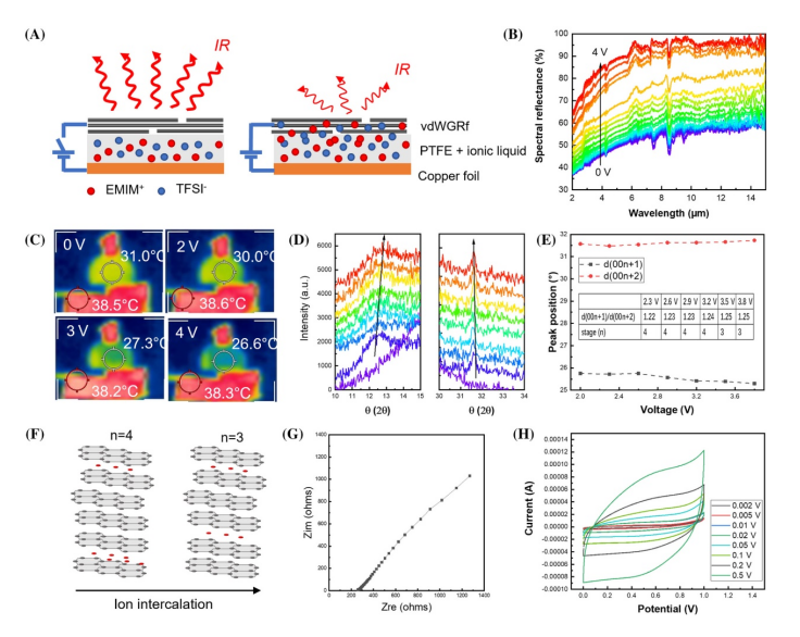 Fig 3. 基于 vdWGRf 的電化學裝置的性能。(A) 電壓關閉(左,高熱輻射)和電壓開啟(右,低熱輻射)的器件結構示意圖。PTFE 基 vdWGRf 注入 EMIMTFSI 離子液體,然后粘附銅膜。(B) 波長為 2–15 μm 的光譜反射率是 0–4 V 施加電壓的函數。(C) 基于 vdWGRf 的電化學裝置在 26°C 室溫下在 38°C 熱板上的熱圖像。(D) 基于 vdWGRf 的電化學裝置在 0–3.4 V 下的原位 XRD 光譜。(E) XRD 峰位置 (00 n + 1), (00 n + 2) 帶電的基于 vdWGRf 的熱調節器。插入表顯示了 vdWGRf 的兩個峰值位置和相應階段相位的比率。(F) 離子嵌入石墨烯層的示意圖。(G) 基于 vdWGRf 的固體電化學裝置的奈奎斯特圖。(H) 基于 vdWGRf 的固體電化學裝置在 0.002 至 0.5 V 掃描速率下的 CV 曲線。