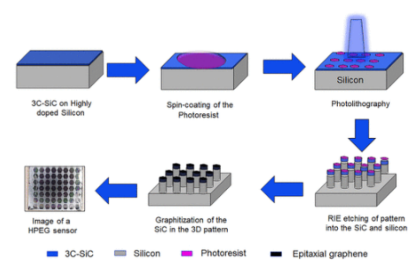圖1. 微圖案石墨烯傳感器的制造過程示意圖。