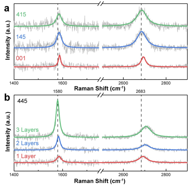 圖6. (a)圖1(a)中銅箔的不同晶面上的拉曼光譜;和(b)圖5(a)中不同石墨烯層上的拉曼光譜。