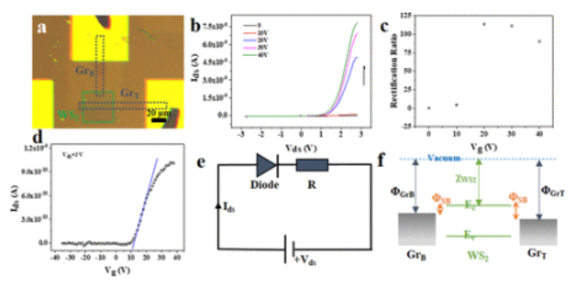 ds=±3 V時的整流率。(d) 器件的傳輸曲線,顯示出N型特性。(e) 器件的等效電路模型,它由一個肖特基二極管和一個串聯電阻組成。(f) 不對稱結構的帶狀圖。兩條石墨烯帶處于不同的電介質環境中。因此,兩個石墨烯帶的費米級是不同的,導致了不對稱的肖特基屏障。Φ